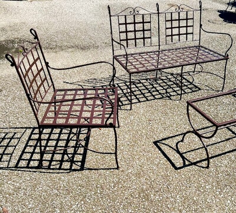 POLTRONA E DIVANO A 2 o A 3 POSTI CON LAMIERA A QUADRETTI PICCOLI O A QUADRI GRANDI (INTRECCIO). POLTRONA L.65 - DIVANO 2 POSTI L.130 - DIVANO 3 POSTI L.195 VERNICIATO GRIGIO ANTRACITE X ESTERNO. realizzabile in altri decori su richiesta (ruggine, bianco, avorio, ecc.). DISPONIBILE ANCHE CUSCINI SU MISURA E SU RICHIESTA COME FOTO.