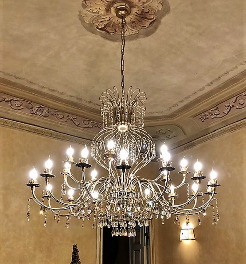 Lampadari in cristallo realizzati su misura anche misure grandi diam 160/170 con struttura metallo in foglia argento, foglia oro, bianco, peltro o altri decori su richiesta. chiedi info per prezzi su misura.